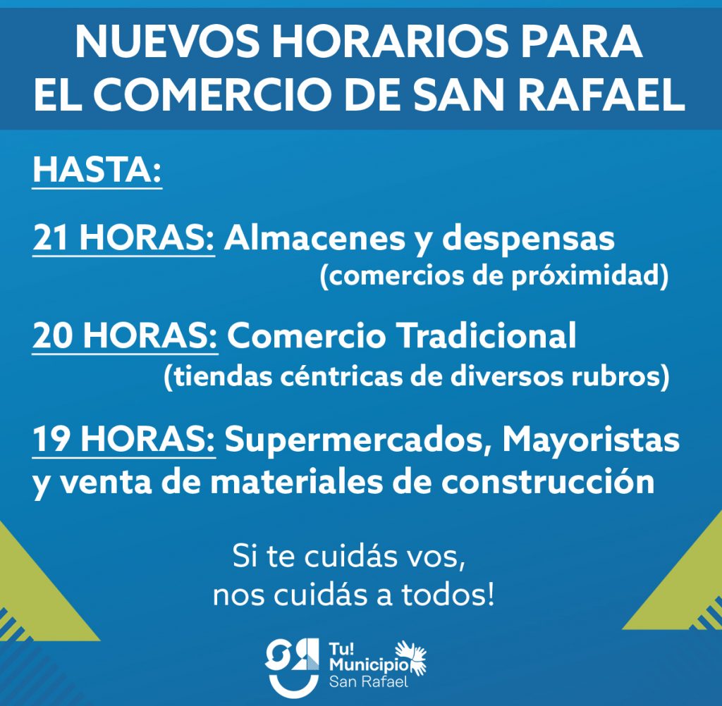 Ante esta nueva flexibilización que desde hoy empieza a regir en el departamento, se renueva el pedido de concientización y compromiso a los comerciantes sanrafaelinos, especialmente en relación al cumplimiento del distanciamiento social, preventivo y obligatorio, de su parte y la de clientes que ingresen a sus locales, con uso obligatorio de tapabocas.