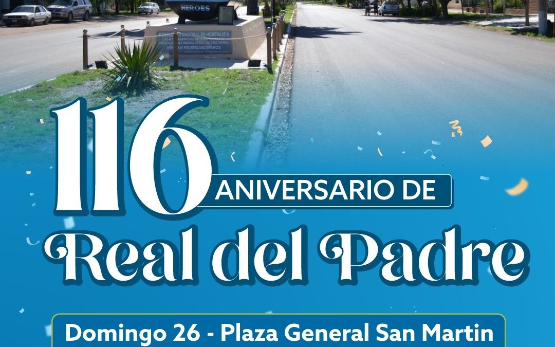 Las actividades por el 116 aniversario de Real del Padre comenzarán el domingo 26 a las 11 de la mañana en la en la Plaza San Martín del distrito. Allí se llevará a cabo el acto protocolar, para luego dar lugar a patio de comidas, feria de artesanos y emprendedores y shows musicales en vivo.