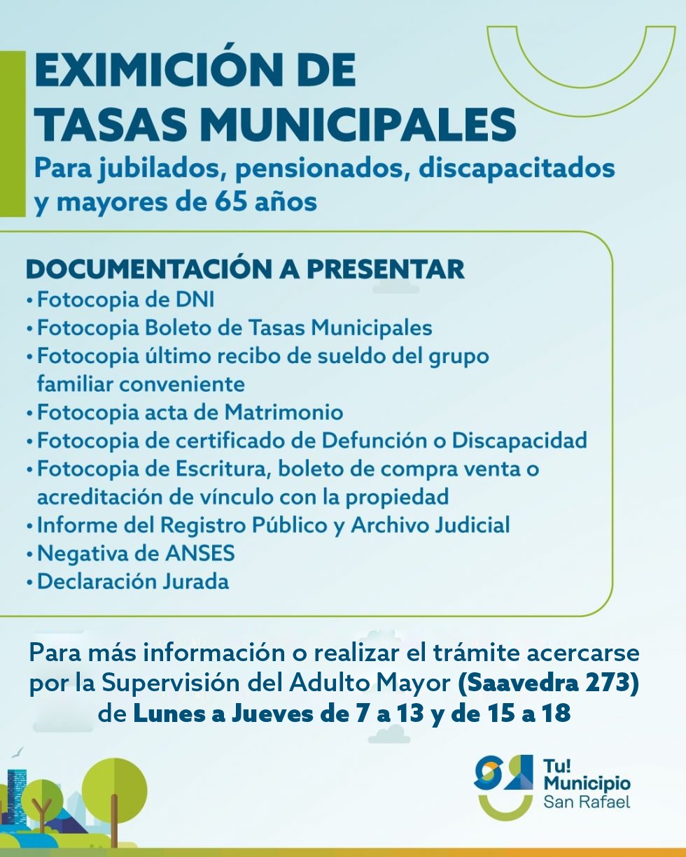 • JUBILADOS Y PENSIONADOS DE SAN RAFAEL PUEDEN ACCEDER AL BENEFICIO DE EXIMICIÓN DE TASAS MUNICIPALES