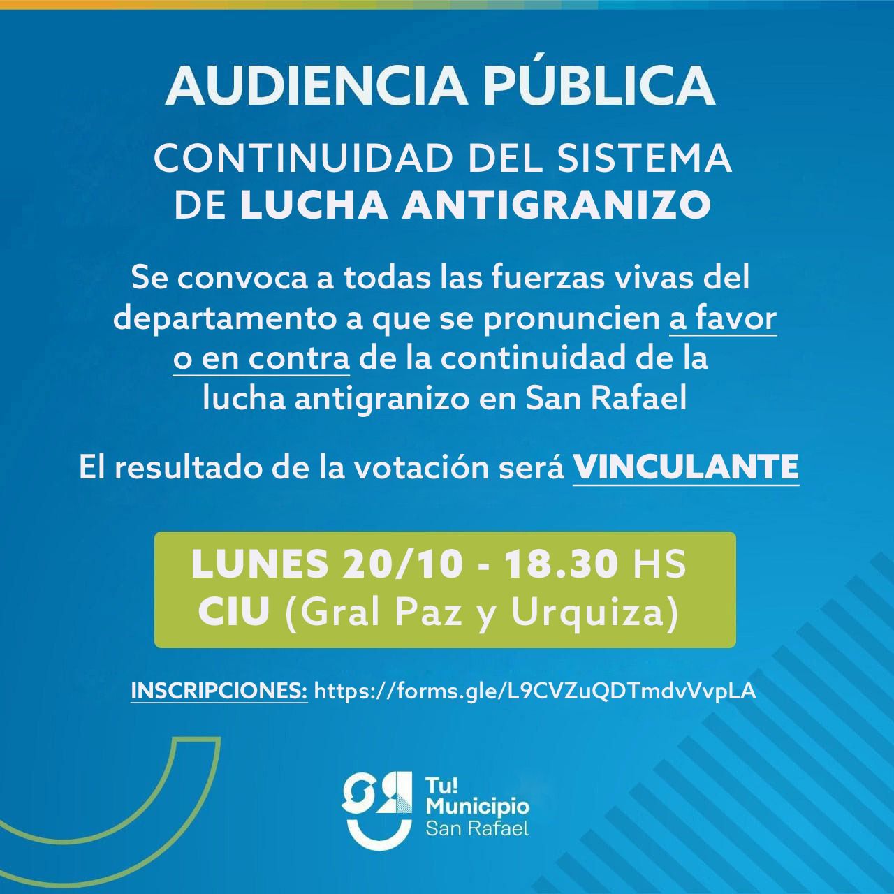 Se trata de una nueva convocatoria a la comunidad organizada del departamento que, el año pasado, por amplia mayoría avaló que el Municipio de San Rafael sostuviese el combate activo contra el granizo. La situación se dio tras la eliminación de dicha herramienta por parte del Gobierno Provincial.