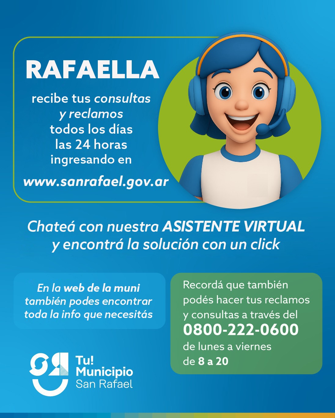 Se recuerda a la comunidad que para efectuar reclamos o consultas pueden utilizar los diferentes medios virtuales que ofrece la web municipal http://www.sanrafael.gov.ar, entre ellos consultas de expedientes, descarga de tasas municipales, solicitud de habilitaciones comerciales, consultas de operativos de limpieza y recolección de residuos, entre otros.