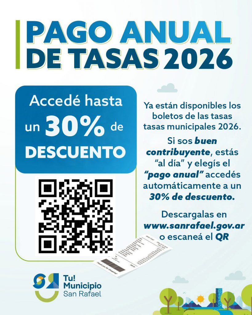 Los boletos de las tasas de 2026 ya fueron emitidos y pueden obtenerse a través del sitio www.sanrafael.gov.ar, también de manera presencial en la sede de la Dirección de Recaudación.